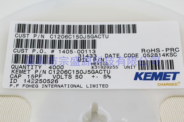 產品名稱:KEMET陶瓷電容 1206 50V 15PF C1206C150J5GACTU